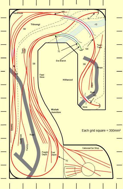 September 2012 I have now installed three Frog Juicers for turnouts in Titirangi and the main line through Waitak Junction. This is certainly a simpler method of powering live frogs and works out to be a comparable price to the Peco micro switch system. The Freight Depot loop and associated spurs have been installed and I have made a start on the steel trestle bridge between Titirangi and Hillwood. February 2013 All turnouts have been motorised and frogs been powered using a Frog Juicer. There are still a few spurs to install but these will be done once I have made a final decision on the types of industry to be constructed. April 2013 Work on the steel trestle bridge between Titirangi and Hillwood is almost complete. The abutments are in and the track fitted (the track still needs to be glued as the scenery still needs to be completed). I still have one pylon to finish and all the furniture to fit but is at the stage where I can run a train over it. The basic scenery for this section of the layout is well underway and I have also made a start on a stone arch bridge for the branch line. At the same time I am also continuing with the fascia boards and making a start on designing the control panel for Titirangi. May 2013 This month hasn't seen much modeling, however, I have managed to finish the final pylon of the steel trestle bridge and also made a good start on the stone arch bridge for the Ere Branch line. The stone bridge is being kit-bashed from two Atlas kits and is coming together nicely. July 2013 The stone arch bridge has now been installed and the basic landscaping in this area is well underway. Ballasting of the track-work has also commenced and the fascia is now in place and just waiting to be painted. This has made a huge difference to how the layout looks even though it is far from finished. The next job is to finish off the staging area and control panels October 2013 The last few months hasn't seen much modeling, however, I have managed to paint the facia and complete the staging area. I have also (finally) managed to make a start on some scenery around Hillwood. It is amazing how hard it is to arrange a few buildings so that they look convincing. The staging area now has a kickback spur and a removable double return loop, each loop being able to hold a 20 car train. This now gives me the ability to hold and turn an entire train without having to reverse it during operating sessions. I have also been spending some time setting up A-Track which is software specifically designed to interface with the NCE system and gives me the ability to control, program locos and consists, and backup the system as a whole via a console. Christmas 2013 Again not much modeling has been happening (I really must do something about work-life balance!). However, I have been doing some preliminary work on developing an operating schedule. I am working on two trains (probably 10 cars or so) arriving at Waitak Junction during the working day, one from each of the WNE interchanges and corresponding trains leaving Waitak Junction. From here there will be locals delivering and setting out cars at local depots and industries. This has highlighted a few points. Firstly I will need to set the layouts' geographical location, albeit fictitious, and I am also going to have to expand Titirangi to include an extra passing siding. It's all part of the fun!! I have also installed curtains around the scenic portion of the bench work. This has made another big difference visually. June 2016 It's been sometime since I have done any work on the WNE due to my 2mm modelling. I have, however, been running trains on a regular basis and have discovered that I not only have to add an additional passing loop at Titirangi, but I will also have to extend the length of the passing loop so that I can hold a standard length train (I have updated the track plan above). I will be modifying this track arrangement later this year and will also add an additional spur to cater for local industries.
